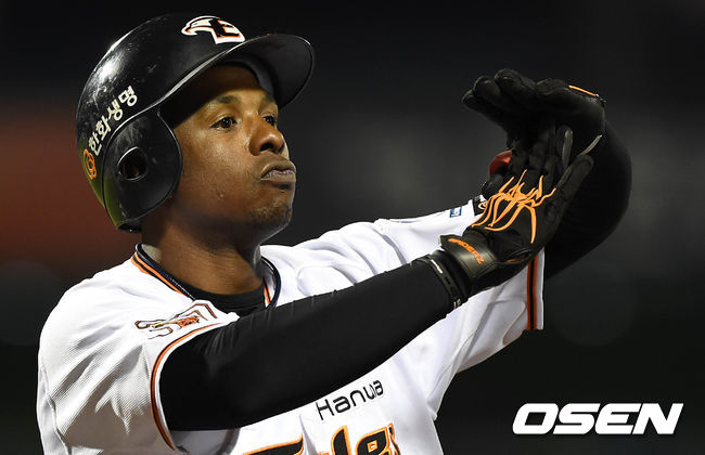 1일 오후 대전 한화생명이글스파크에서 열린 '2015 타이어뱅크 KBO 리그' 한화 이글스와 두산 베어스의 경기, 8회말 2사 주자 1,3루 한화 모건이 1타점 적시타를 치고 주루하고 있다.