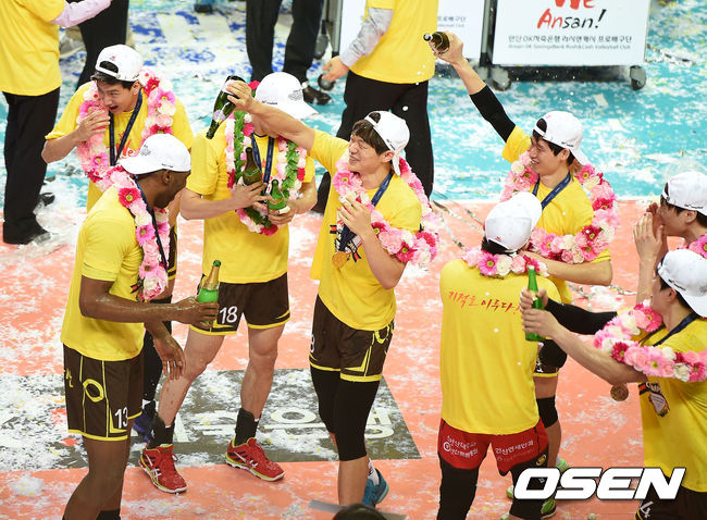 OK 저축은행 선수들이 샴페인 세리머니를 하며 우승을 기뻐하고 있다. /jpnews@osen.co.kr