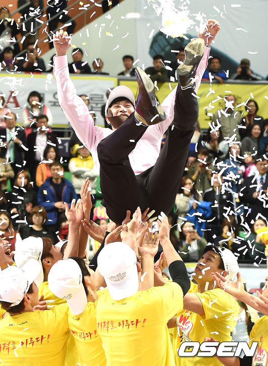 OK 저축은행 김세진 감독이 헹가래를 받으며 우승을 기뻐하고 있다. /jpnews@osen.co.kr