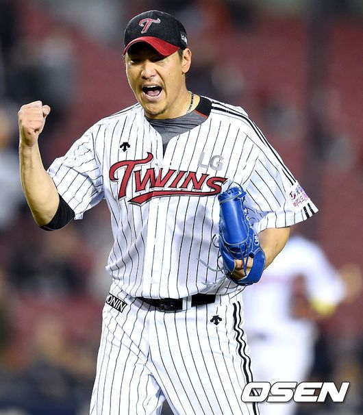 연장 10회초 2사 2루 상황 김대우를 삼진으로 이끌며 무실점으로 이닝을 마친 LG 투수 이동현이 환호하고 있다.