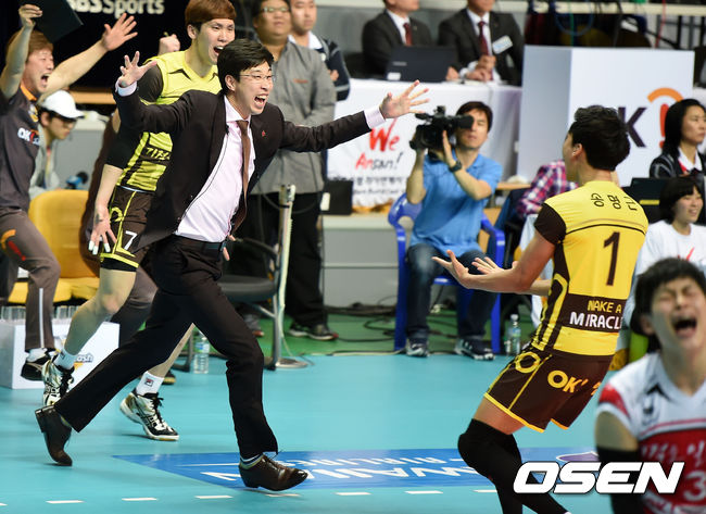 OK 저축은행 김세진 감독이 우승이 확정되며 송명근과 기뻐하고 있다. /jpnews@osen.co.kr