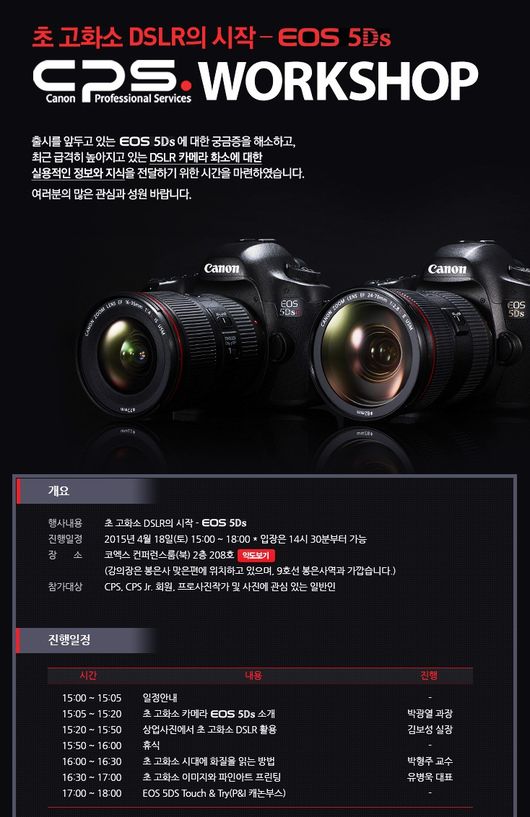 오는 16일 개막하는 P&I 2015 기간 중에 펼쳐지는 이번 CPS 워크숍은 '초고화소 DSLR의 시작 - EOS 5Ds'라는 주제로 세계 최초 약 5060만 화소 DSLR 캐논 'EOS 5Ds'에 대해서 전문가를 초청해 강연을 펼친다.