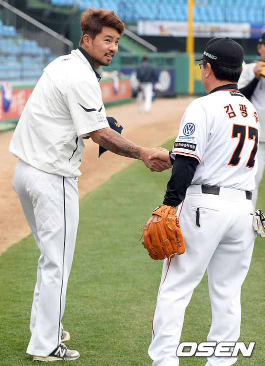 2일 오후 대전 한화생명이글스파크에서 열린 '2015 타이어뱅크 KBO 리그' 한화 이글스와 두산 베어스의 경기,경기시작전 두산 오재원이 한화 김광수 코치와 인사를 나누고 있다.
