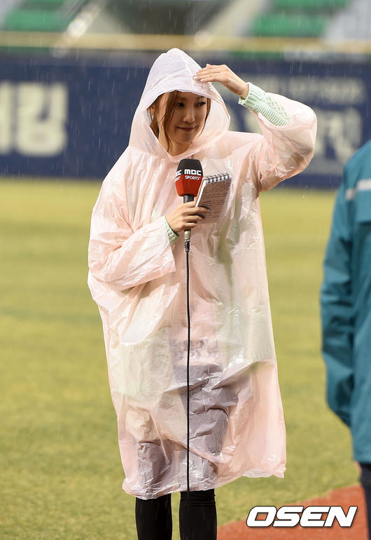 구새봄 MBC스포츠플러스 아나운서가 비를 맞으며 방송을 진행하고 있다./sunday@osen.co.kr