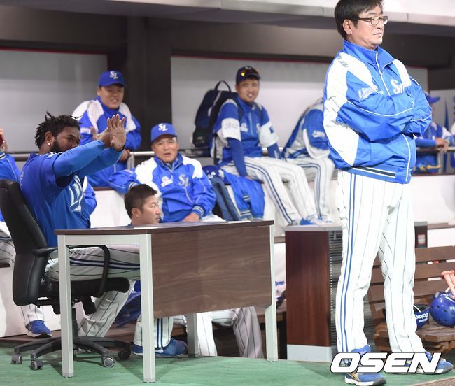 삼성 나바로가 더그아웃에서 장난을 치고 있다./dreamer@osen.co.kr