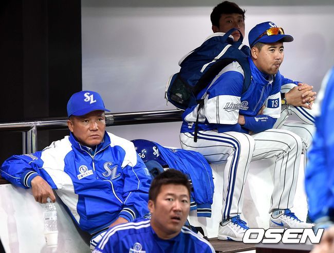 삼성 장원삼을 비롯한 선수들과 코칭스태프가 비오는 그라운드를 바라보고 있다./dreamer@osen.co.kr