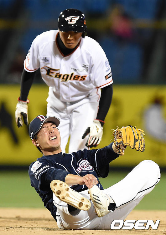 2일 오후 대전 한화생명이글스파크에서 열린 '2015 타이어뱅크 KBO 리그' 한화 이글스와 두산 베어스의 경기, 2회말 1사 주자 1루 두산 김재호가 한화 강경학의 타구를 병살처리시키고 넘어져 있다.