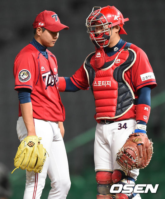 2일 오후 인천SK행복드림구장에서 열린 '2015 타이어뱅크 KBO 리그' SK 와이번스와 KIA 타이거즈의 경기 3회말 2사 만루 임기준과 이홍구가 이야기를 나누고 있다.