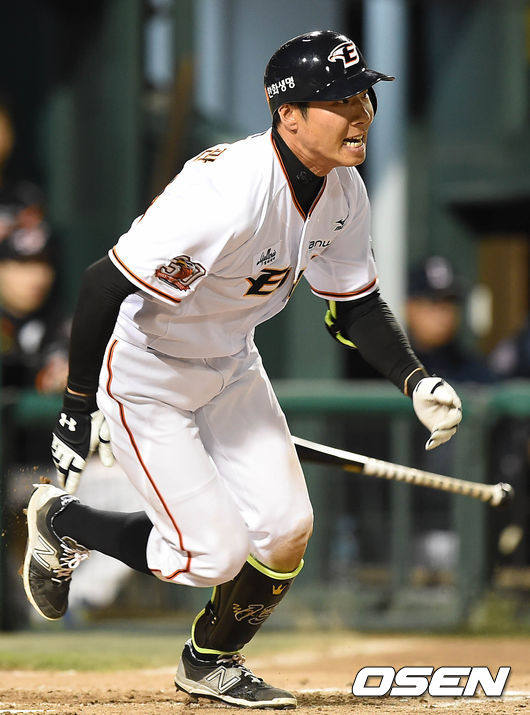2일 오후 대전 한화생명이글스파크에서 열린 '2015 타이어뱅크 KBO 리그' 한화 이글스와 두산 베어스의 경기, 4회말 무사 주자 1,2루 한화 권용관이 1타점 적시타를 치고 있다.