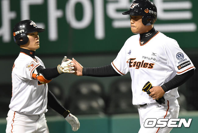 2일 오후 대전 한화생명이글스파크에서 열린 '2015 타이어뱅크 KBO 리그' 한화 이글스와 두산 베어스의 경기, 4회말 무사 주자 1,2루 2루주자 최진행이 권용관의 1타점 적시타에 홈을 밟고 강경학과 기쁨을 나누고 있다.