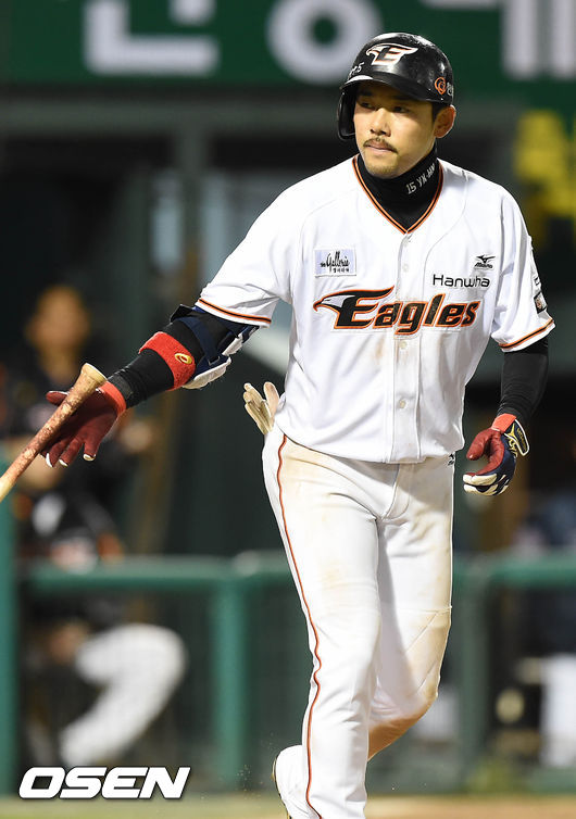 2일 오후 대전 한화생명이글스파크에서 열린 '2015 타이어뱅크 KBO 리그' 한화 이글스와 두산 베어스의 경기, 4회말 1사 주자 만루 한화 이용규가 볼넷으로 밀어내기 득점을 올리고 있다.