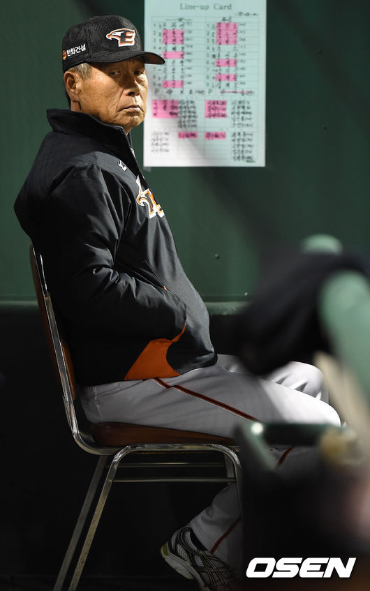 2일 오후 대전 한화생명이글스파크에서 열린 '2015 타이어뱅크 KBO 리그' 한화 이글스와 두산 베어스의 경기, 한화 김성근 감독이 더그아웃에서 경기를 지켜보고 있다.