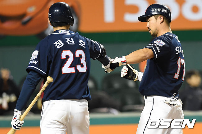 2일 오후 대전 한화생명이글스파크에서 열린 '2015 타이어뱅크 KBO 리그' 한화 이글스와 두산 베어스의 경기, 5회초 2사 주자 1,2루 두산 오재원이 김재호의 안타에 홈을 밟고 정진호와 기쁨을 나누고 있다.