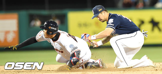 2일 오후 대전 한화생명이글스파크에서 열린 '2015 타이어뱅크 KBO 리그' 한화 이글스와 두산 베어스의 경기, 5회말 한화 선두타자 최진행이 타격 이후 2루에서 아웃되고 있다.