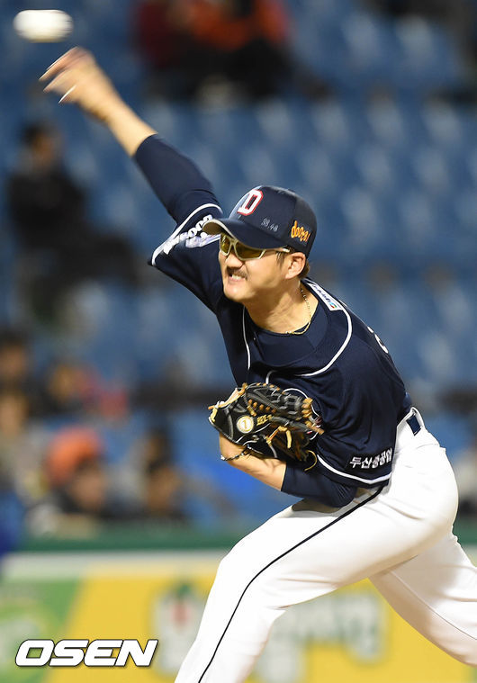 2일 오후 대전 한화생명이글스파크에서 열린 '2015 타이어뱅크 KBO 리그' 한화 이글스와 두산 베어스의 경기, 6회말 무사 주자 1루 마운드에 오른 두산 이재우가 힘차게 공을 던지고 있다.