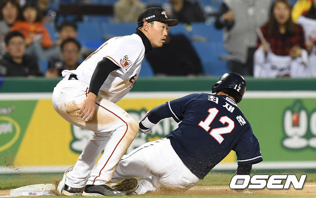 2일 오후 대전 한화생명이글스파크에서 열린 '2015 타이어뱅크 KBO 리그' 한화 이글스와 두산 베어스의 경기, 7회초 1사 1루주자 최재훈이 김재환의 안타에 슬라이딩으로 3루에서 세이프되고 있다.