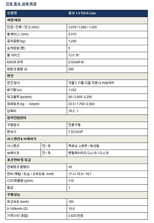 국내에 선보이는 최신 기술이 집약된 신형 폴로에는 기존의 1.6 TDI 대신 폭스바겐의 혁신적인 엔진 다운사이징 기술로 탄생한 차세대 커먼레일 3기통 1.4 TDI 엔진과 함께 7단 DSG 변속기가 조합되었다. 다운사이징에도 불구하고 최대토크 23.5kg•m(1,750~2,500rpm), 최고출력 90마력(3,000~3,250rpm)의 넉넉한 힘으로 가속이나 고속 주행 시에도 꾸준한 추진력을 제공해 동급에서 경험할 수 없는 '펀-투-드라이브(Fun-to-drive)'를 선사한다. 정지상태에서 100km/h까지 도달하는데 걸리는 시간 10.9초, 안전 최고 속도는 184km/h이다. 가격은 2,620만원(VAT포함).