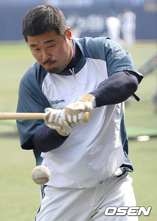 3일 오후 창원 마산구장에서 열리 '2015 타이어뱅크 KBO 리그' NC다이노스와 한화 이글스의 경기, 경기시작전 NC 이호준이 타격연습을 하고 있다.