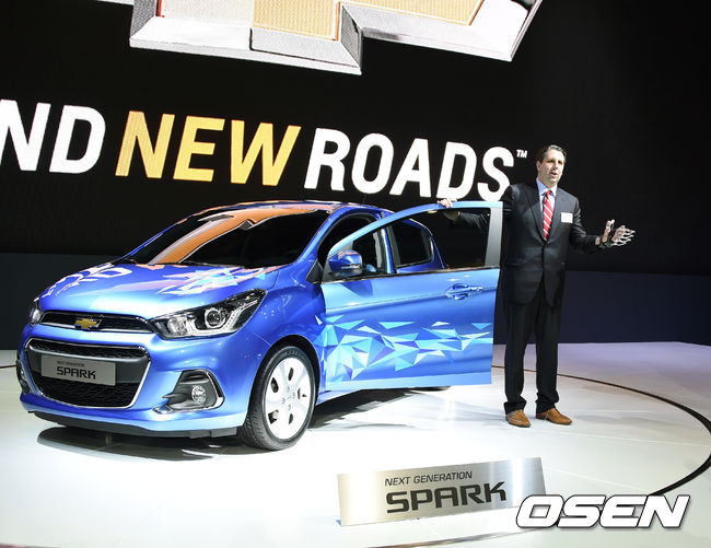 2015 서울 모터쇼 쉐보레 전시관을 찾은 마크 리퍼트 미국 대사가 3일 서울모터쇼 쉐보레 전시관을 찾아 신형 스파크 옆에서 포즈를 취하고 있다. 아래 사진은 리퍼트 대사에게 전시관을 안내하고 있는 마크 코모 쉐보레 부사장. 오른쪽은 윤대성 수입차협회 전무.