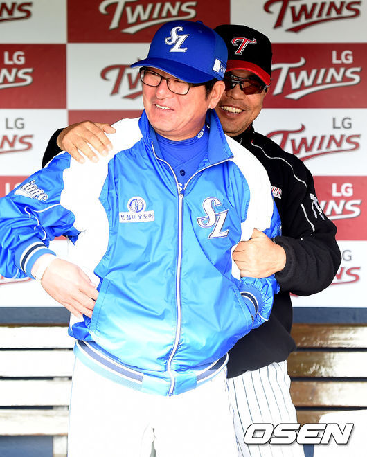 3일 오후 서울 잠실야구장에서 열린 '2015 타이어뱅크 KBO 리그' LG 트윈스와 삼성 라이온즈의 경기, 경기에 앞서 삼성 류중일 감독과 LG 양상문 감독이 인사를 나누고 있다.