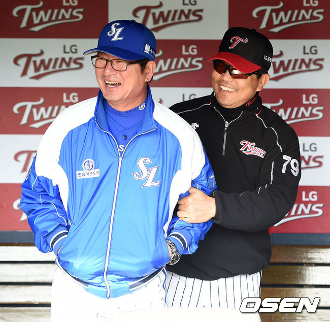 3일 오후 서울 잠실야구장에서 열린 '2015 타이어뱅크 KBO 리그' LG 트윈스와 삼성 라이온즈의 경기, 경기에 앞서 삼성 류중일 감독과 LG 양상문 감독이 인사를 나누고 있다.