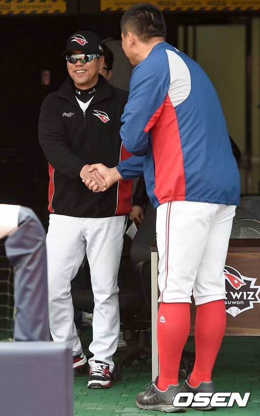3일 오후 경기도 수원 케이티 위즈파크에서 열리는 '2015 타이어뱅크 KBO리그' kt 위즈와 KIA 타이거즈의 경기를 앞두고, kt 조범현 감독과 KIA 최희섭이 인사를 나누고 있다.
