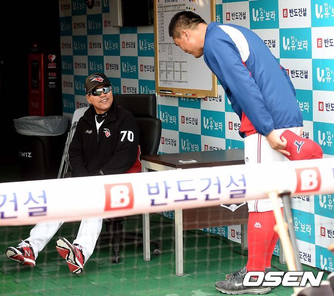 3일 오후 경기도 수원 케이티 위즈파크에서 열리는 '2015 타이어뱅크 KBO리그' kt 위즈와 KIA 타이거즈의 경기를 앞두고, kt 조범현 감독과 KIA 최희섭이 인사를 나누고 있다.