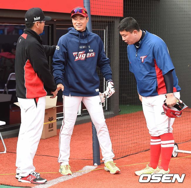 3일 오후 경기도 수원 케이티 위즈파크에서 열리는 '2015 타이어뱅크 KBO리그' kt 위즈와 KIA 타이거즈의 경기를 앞두고, kt 조범현 감독과 KIA 김원섭-나지완이 인사를 나누고 있다.