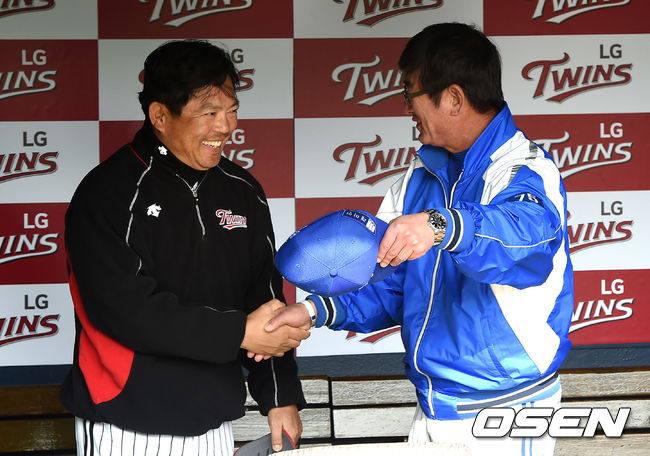 3일 오후 서울 잠실야구장에서 열린 '2015 타이어뱅크 KBO 리그' LG 트윈스와 삼성 라이온즈의 경기, 경기에 앞서 LG 양상문 감독과 삼성 류중일 감독이 인사를 나누고 있다.