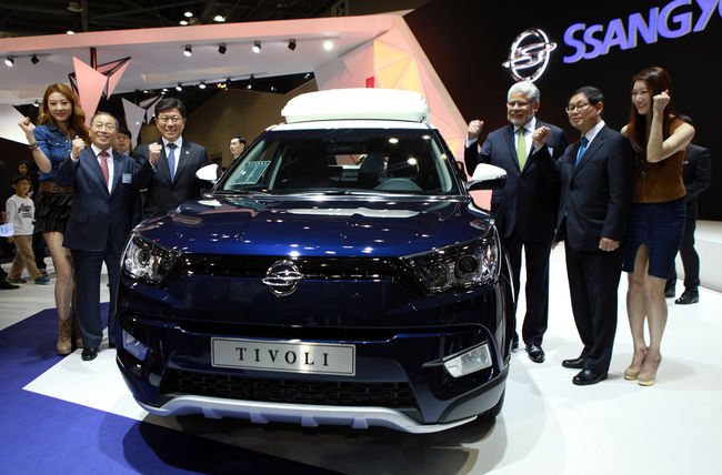 이날 쌍용차의 부스에는 윤상직 산업통상자원부 장관이 방문, 쌍용차의 글로벌 전략 차종인 소형 SUV '티볼리'를 직접 탑승했다.