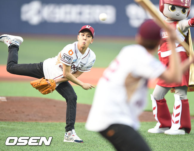 3일 오후 서울 목동구장에서 열린 '2015 타이어뱅크 KBO리그' 넥센 히어로즈와 SK 와이번스의 경기에 앞서 그룹 빅플로가 시구 시타를 하고 있다.