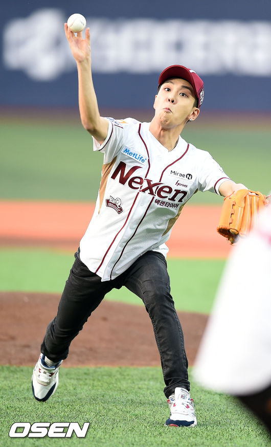 3일 오후 서울 목동구장에서 열린 '2015 타이어뱅크 KBO리그' 넥센 히어로즈와 SK 와이번스의 경기에 앞서 그룹 빅플로가 시구 시타를 하고 있다.