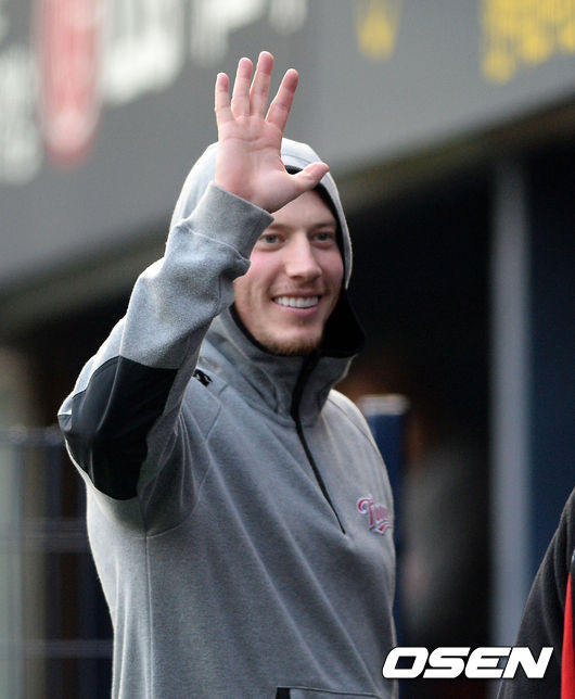 3일 오후 서울 잠실야구장에서 열린 '2015 타이어뱅크 KBO 리그' LG 트윈스와 삼성 라이온즈의 경기, 경기에 앞서 LG 루카스가 환한 미소를 짓고 있다.