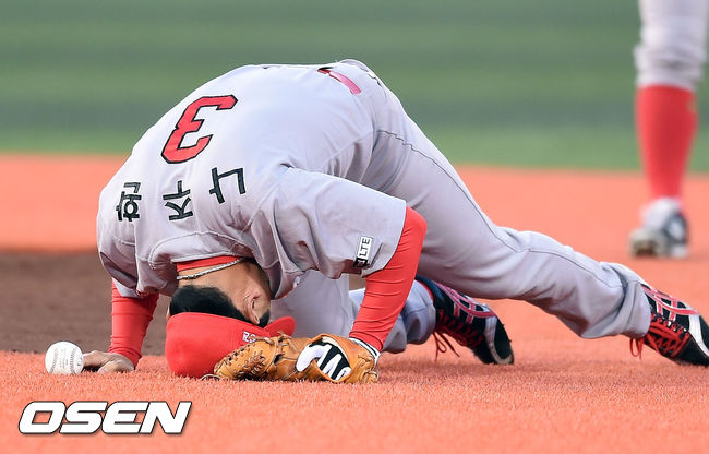 3일 오후 서울 목동구장에서 열린 '2015 타이어뱅크 KBO리그' 넥센 히어로즈와 SK 와이번스의 경기,1회말 넥센 서건창의 내야땅볼 타구 수비 도중 부상을 당한 SK 나주환이 고통스러워하고 있다.