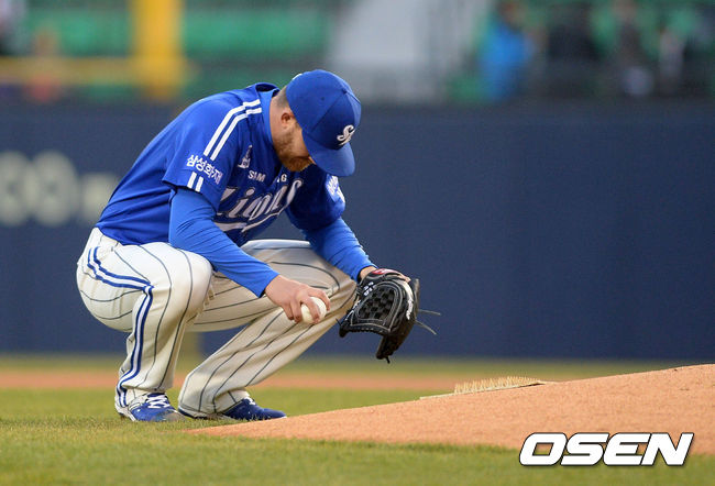 3일 오후 서울 잠실야구장에서 열린 '2015 타이어뱅크 KBO 리그' LG 트윈스와 삼성 라이온즈의 경기, 1회말 삼성 클로이드가 마운드에 올라 생각에 잠겨 있다.