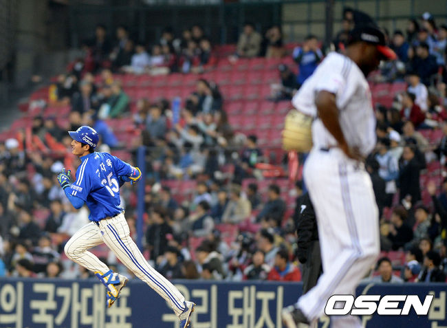 3일 오후 서울 잠실야구장에서 열린 '2015 타이어뱅크 KBO 리그' LG 트윈스와 삼성 라이온즈의 경기, 2회초 1사 1루에서 삼성 구자욱이 선취 우월 투런포를 날리고 그라운드를 돌고 있다.