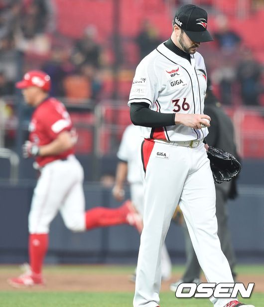 2회초 KIA 공격 1사 주자없는 상황 최희섭에게 선제 중월 솔로포를 허용한 kt 선발 어윈이 아쉬워하고 있다.