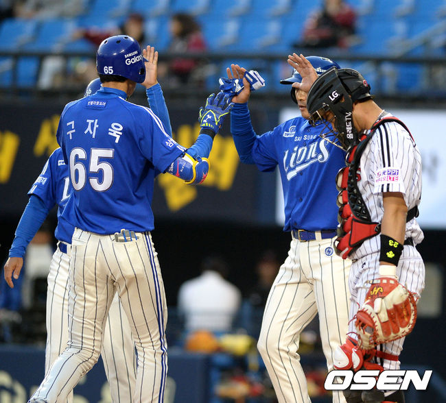 3일 오후 서울 잠실야구장에서 열린 '2015 타이어뱅크 KBO 리그' LG 트윈스와 삼성 라이온즈의 경기, 2회초 1사 1루에서 삼성 구자욱이 선취 우월 투런포를 날리고 홈을 밟으며 이승엽과 하이파이브를 하고 있다.