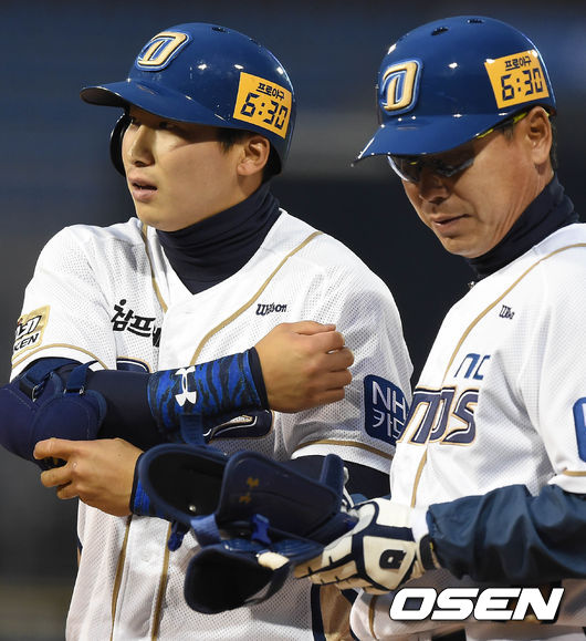 3일 오후 창원 마산구장에서 열리 '2015 타이어뱅크 KBO 리그' NC다이노스와 한화 이글스의 경기, 1회말 1사 주자 3루 NC 나성범이 1타점 적시타를 치고 코치와 기쁨을 나누고 있다.