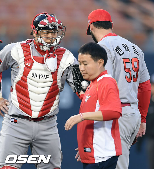 3일 오후 서울 목동구장에서 열린 '2015 타이어뱅크 KBO리그' 넥센 히어로즈와 SK 와이번스의 경기,1회말 2실점 허용한 SK 밴와트가 정상호 포수와 이야기를 나누고 있다.