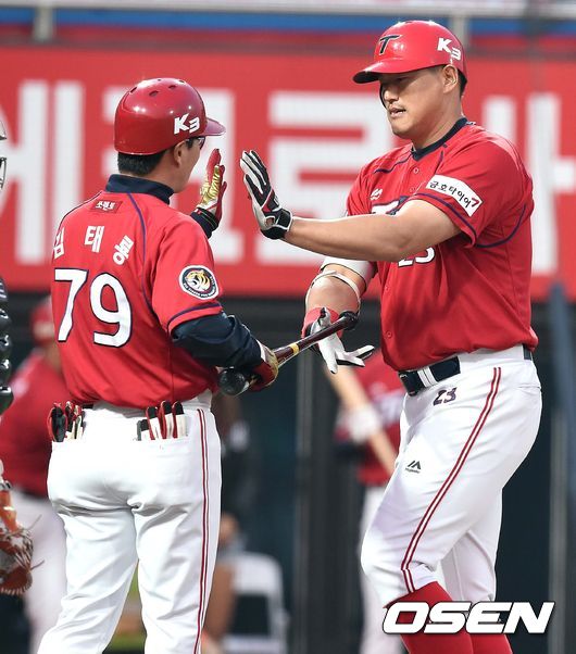 2회초 KIA 공격 1사 주자없는 상황 최희섭이 선제 중월 솔로포를 날리고 홈을 밟으며 김태룡 코치와 인사를 나누고 있다.