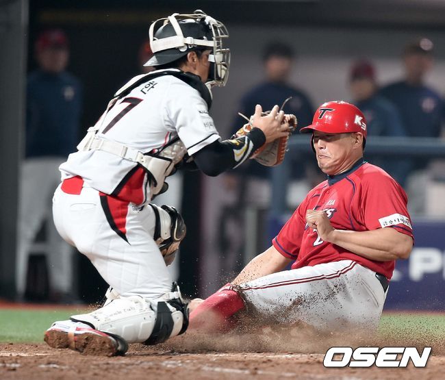 5회초 kt 공격 무사 1, 2루 상황 김다원의 좌전안타 때 홈으로 쇄도한 KIA 최희섭이 kt 포수 용덕한의 태그에 걸려 아웃되고 있다.