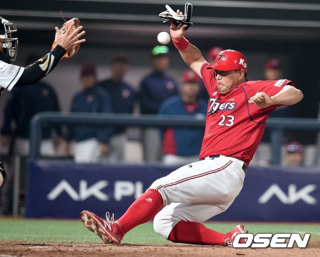 5회초 kt 공격 무사 1, 2루 상황 김다원의 좌전안타 때 홈으로 쇄도한 KIA 최희섭이 kt 포수 용덕한의 태그에 걸려 아웃되고 있다.
