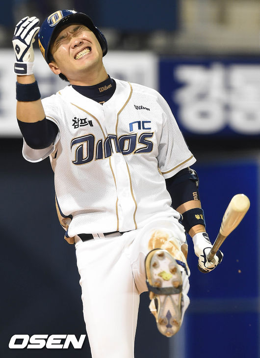 3일 오후 창원 마산구장에서 열리 '2015 타이어뱅크 KBO 리그' NC다이노스와 한화 이글스의 경기, 4회말 2사 주자 없는 상황 NC 지석훈이 헛스윙 삼진을 당하고 아쉬워 하고 있다.