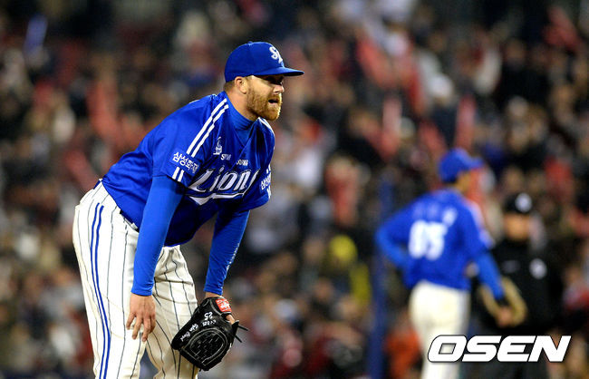 3일 오후 서울 잠실야구장에서 열린 '2015 타이어뱅크 KBO 리그' LG 트윈스와 삼성 라이온즈의 경기, 5회말 1사 만루에서 삼성 클로이드가 LG 정성훈에 사구를 허용, 밀어내기로 실점을 하며 아쉬워하고 있다.