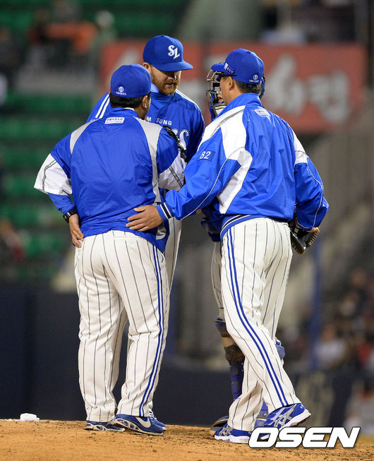 3일 오후 서울 잠실야구장에서 열린 '2015 타이어뱅크 KBO 리그' LG 트윈스와 삼성 라이온즈의 경기, 5회말 삼성 김태한 코치가 마운드에 올라 클로이드를 격려하고 있다.