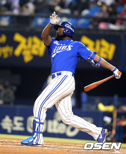 3일 오후 서울 잠실야구장에서 열린 '2015 타이어뱅크 KBO 리그' LG 트윈스와 삼성 라이온즈의 경기, 6회초 1사에서 삼성 나바로가 솔포로를 날리고 있다.