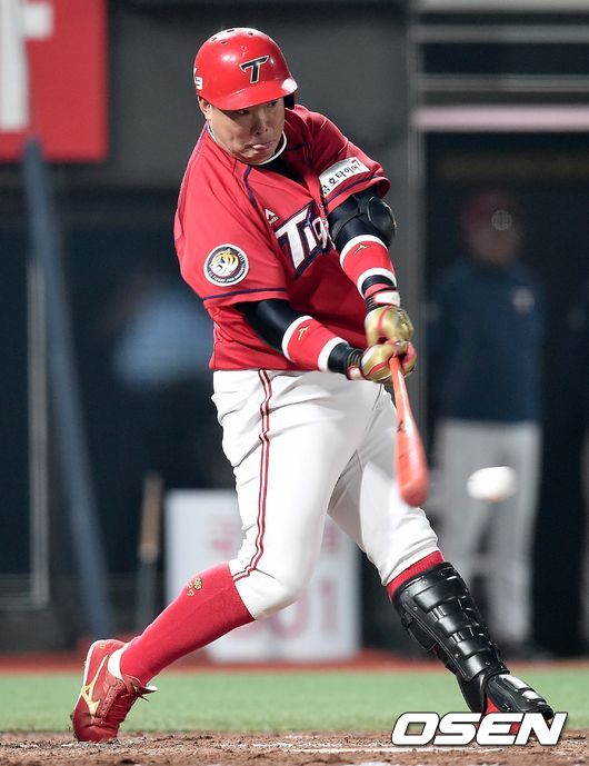 6회초 KIA 공격 2사 2루 상황 나지완이 적시 1타점 좌전안타를 날리고 있다.