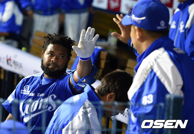3일 오후 서울 잠실야구장에서 열린 '2015 타이어뱅크 KBO 리그' LG 트윈스와 삼성 라이온즈의 경기, 6회초 1사에서 삼성 나바로가 솔포로를 날리고 더그아웃에서 동료선수들과 하이파이브를 하고 있다.