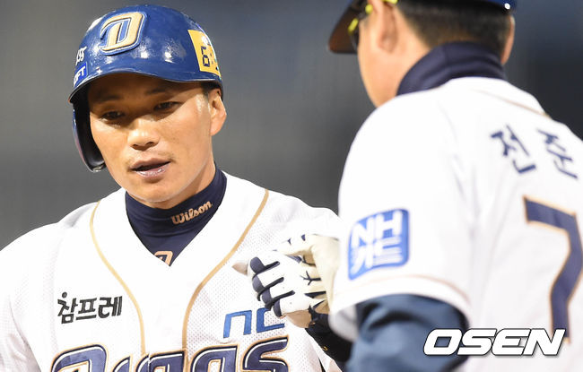 3일 오후 창원 마산구장에서 열리 '2015 타이어뱅크 KBO 리그' NC다이노스와 한화 이글스의 경기, 5회말 무사 주자 1루 NC 이종욱이 주자 무사 1,3루를 만드는 안타를 치고 전준호 코치와 기쁨을 나누고 있다.
